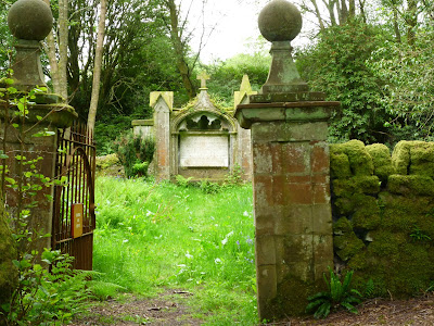 Yesterday we turned right instead of left on leaving the house and walked through to Ross Priory. Rosie was kept under a fairly tight rein down the long drive as she does like to chase the golf balls if she has an opportunity. Just by the turn to the Water Board there is also a path off to the right. It wasn't too muddy although it has been unpassable without wellies earlier in the year. Before long we reached the small enclosed burial ground of the Macdonald-Buchanans. This is a very special place now largely overgrown. Through the gates are the graves of Jean Buchanan and Hector Archibald Buchanan, her husband, and six of their nine children. The plaque at the end gives details of their names and it can be seen that the three missing children are buried where they died - in Bombay, Gibralter and Malta. It was Hector and Jean who extended and embellished Ross Priory creating the fine building we still admire today. Their burial place also has a certain grandeur.
