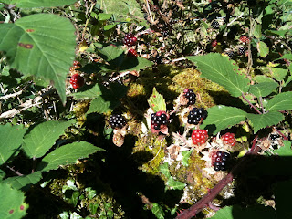 As if the prickles of the bramble weren't weapon enough to deter the picker, they also manage to grow amidst a host of the other well-armed plants. There is a magnificent crop along the short cut up to the Hall but you need to be well protected. I fought my way through nettles, hawthorn, dog roses, gorse, thistles and holly to reach the best berries. This is where a stick comes in handy; although I found the Leki pole not nearly as effective as the old fashioned walking stick with the curved handle for grabbing that best spray of fruit that always seems to be just out of reach.